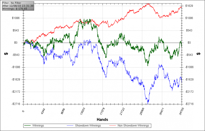 Соответственно, мне нужно быть луз/тайт наоборот, по теории игр: продолжать блефовать сильными линиями, чтобы выбивать/добирать с его слабых рук, которые он упорно не выкидывает, но меньше оплачивать его руки, когда он агрессивен. Это работает.