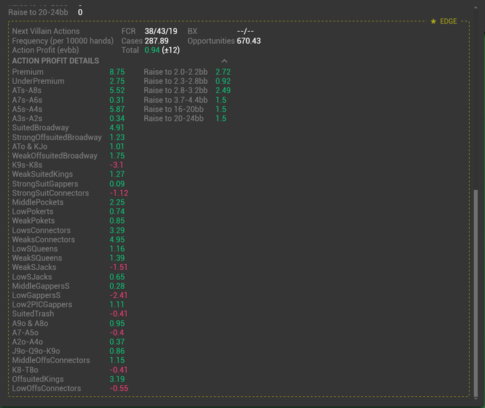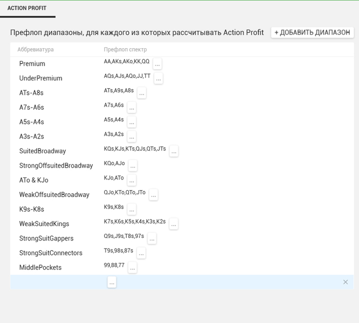 Джентльмены, я пишу категории рук для экшн профита в h2n Мне нужен доброволец с винрейтом более 7бб/100, обладающий более 350к своих рук с лимитов Nl50-Nl100, который хочет поучаствовать в прогоне. Зачем это мне? Я составлю оптимальные диапазоны открытия по позициям, после того как прогоню эти руки в H2N EDGE, которая в блайндах показывает среднюю разницу стека с момента открытия заданных групп рук и моментом когда раздача закончилась. Зачем это тестируемому человеку? Он увидит какие руки открывает в минус и насколько минус сильный. Интересно было бы прогнать кого-то лузово-агрессивного, но если нет, то я не расстроюсь. Предложение действует пару часов. Потом я забью и прогоню свои 150к и буду пользоваться не до конца точной инфой. Пишите в личку, кто заинтересовался
