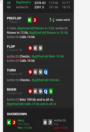 Бомбпот, на флопе сыграл ч/р на ставку 25% от рега, терн 1/3, ривер офк спарился. Подумал что добирать вообще не с чего, т.к. еще с флопа прикидывал его ренж как допера, какие-нибудь комбодро, но и чек-кол так себе выглядит, надеяться что он тут превратит 69 или 87 с черной в блеф...кароч такое, сыграли чек/чек