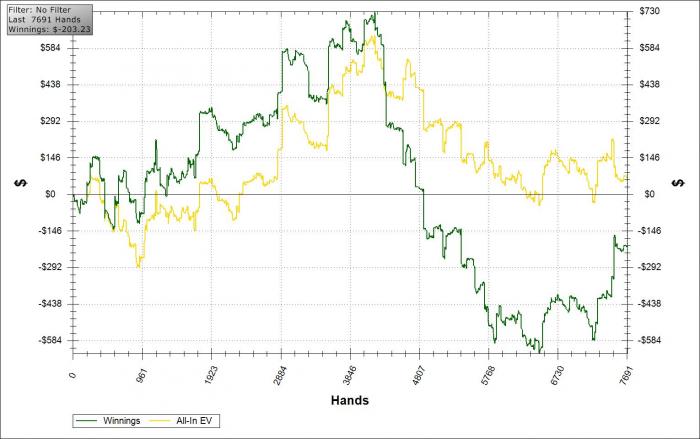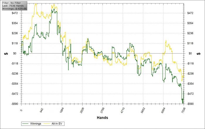 Вообще не ладилось с самого начала, каждый раз выставляясь с натсовой рукой мне фиши показывали сеты и монстродро, и если по началу я более менее стабильно выигрывал сравнения типа 65/35, то ближе к концу как отрезало. Только на одних АК я залил стека три, оллин против фиша <AQ префлоп на полуторный стек стал венцом того чудесного периода.