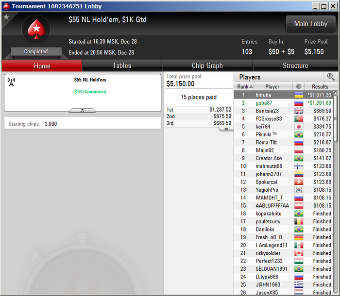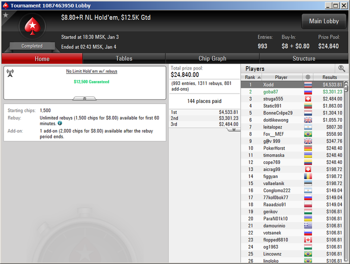 Но все равно доволен прогрессом: на этот раз попал в деньги! Турнир отличный, осталось только научиться делать нокауты))