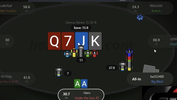 Мелкая ставка по флопу в этой ситуации может иметь смысл только против мегапетуха, у которого очко сгорит не почекрейзить на малку такую доску. Но utg, все таки, поэтому с такой рукой на твоих лимитах просто ставишь потбет, собираешь тонну велью и не париишься. Даже по гто тут точно потбет будет ок, если вдруг ты не фанат эксплойт страты.