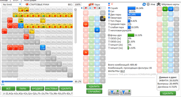 К чему это я, как вот можно что то считать, если я понятия не имею как опп сыграет, я даже порой понятия не имею как я тут сыграю на месте бб, скажем с KJ красными или JQ черными. А че уж говорить про опа и как задавать ему ветки если мы понятия не умеем рейзит он тут или колит флоп ФД, а сэты а две пары? а терном он что пушит КТ красные пушит? а 9То?