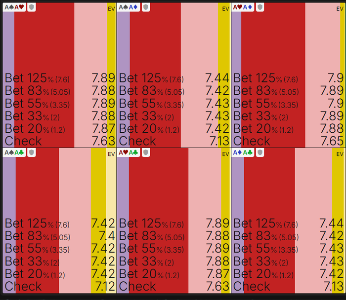 И я не говорил, что сайзинг 33% на флопе с АА в такую структуру - единственно верная игра. Можем поднять сайзинг контбета на флопе до 50% или 75%, но у позиции ББ широкий и слабый диап, на увеличенный сайз будет супер много фолдов в такой структуре, а мы с вэлью руками хотим получать колы от разумного количества рук слабее, а не выбивать их. Зачем нам фолд от 7х, Jх рук или кармашек по типу 88-TT, когда мы с радостью получим от них колы? Иногда даже и на тёрне, если опп совсем не очень в покере. Я считаю, что твой вариант 125% флоп - х% тёрн = просто зарабатывает меньше, а проигрывает больше в случае, когда у оппонента будет рука сильнее уже со флопа. А она там будет сильнее офигеть как чаще, когда мы получим колл на cbet 125% по флопу от позиции ББ. Если бы у нас в руке был красный А, то наша ситуация была бы еще хуже, потому что у оппонента резко снижается желание на 125% протягивать не натсовый ФД, потому что все красные Ах у нас в диапе с полным весом.