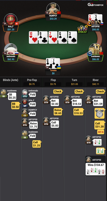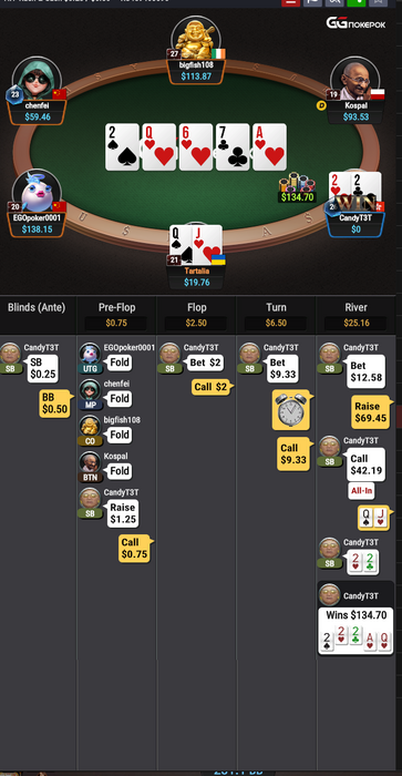 Взять руку из отбоя так далеко за ренжом, что это даже смешно. Чек-рейзнуть, к риверу натянуть бэкдорный стрит и уебать мой сет, предварительно меня слоурольнув, сидя с натсом. В принципе, пожелание выпавшего ануса уже не кажется мне за гранью=)