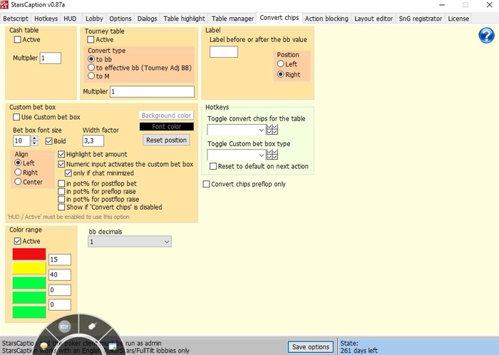 6A6ARH6A6yNH, я думал над этим, но исходя из того, что я сейчас могу делать на столе, у меня в этом плане есть некоторые ограничения. Например, я не могу нажимать скрытые или невидимые кнопки (на Пати или 888 могу). По этой причине я могу представить, как я мог бы сделать собственное меню установки нотса, которое будет работать как прокси настоящего меню (на Пати это именно так и сделано - ты кликаешь по метке в моём диалоге установки нотса, после чего PartyCaption кликает соответствующую кнопку в родном меню установки нотса, хотя само это меню может вообще не появляться). Я могу сделать аналогичную штуку в StarsCaption, хотя сделать здесь её будет существенно сложнее - как минимум потому, что это меню может быть произвольного размера и с произвольным набором цветов. При этом я ещё вижу, как я могу реализовать этот вариант в ситуации, когда это меню полностью отображается на столе. Но вот когда его нужно прокручивать - это сильно сложнее, и тут программе тоже придётся его прокручивать, потому что я не умею кликать скрытые кнопки на Старзах.