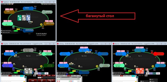 3) Лейаут иногда подглючивает, забывает цвет (или прозрачность) шрифтов никнеймов (а вроде ещё и стеков) игроков. А ещё забывает что надо скрывать верхне-боковые панели типа вызова реплеера. Столы которые уже открыты работают безотказно. Этот баг довольно редкий происходит при открытии очередного стола с этим "новым" столом.