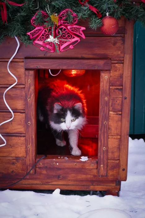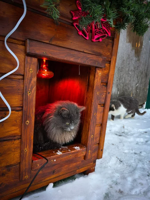 Сделал им будку, внутри коврик с подогревом и в "прихожей" работает греющая лампа, её работы хватает чтоб даже в - 15 вода не замерзала, и сама будка утепленна.