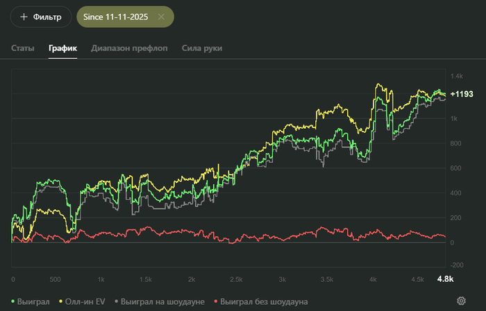 Я вернул 3беты, широкие ренджи (даже против фишей еще шире начал опенить) и все вроде стабилизировалось