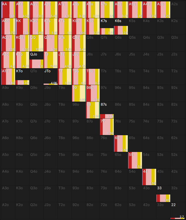 по иллюстрации видно что ставим большим сайзингом мы еще ГАТШОТЫ АТ Короли , оч много блефов низкими парами 33-77, 98с гатшот , много A3s-A6s в блеф, K9s-K8s