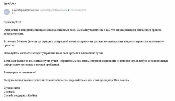 kolyvan, Здравствуйте! Напишите на нашу почту support@redstarpoker.eu и мы предоставим Вам транзакции по аккаунту, в них сможете проверить поступление возврата средств.