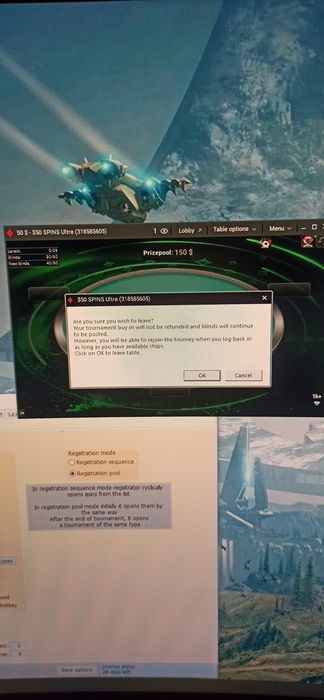 У клиента Пати есть небольшой баг - когда ты вылетаешь из турнира, то он полагает, что ты всё ещё играешь, и это продолжается до тех пор, пока шоудаун этой руки не закончился и не началась новая рука. По этой причине это окно будет появляться, если пытаться закрыть стол сразу после окончания турнира.