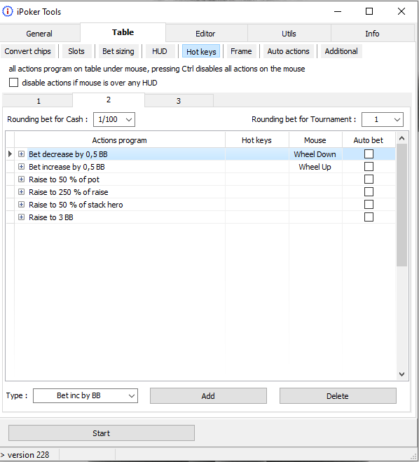 Подскажите, как в IpokerTools сделать, чтобы колёсиком мышки прокручивалось по smb, а не bb. И в горячих клавишах я не нашёл кнопки all in. Она вообще есть?