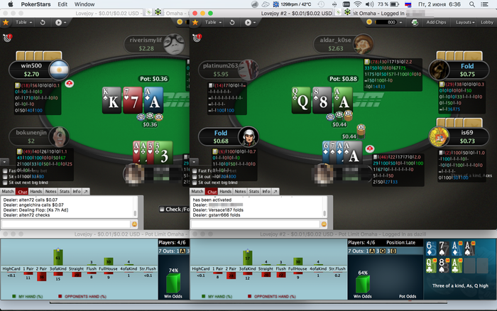 Если бы не креста, я бы сыграл на терне 3бетом, пытаясь забрать банк. Но я побоялся, что с крестой он не выкинет на 3бет, а запихнется, т.к. блокеры на пло2 не рулят и люди могут пихнуть нестаршее ФД (плюс например пара) не по шансам.
