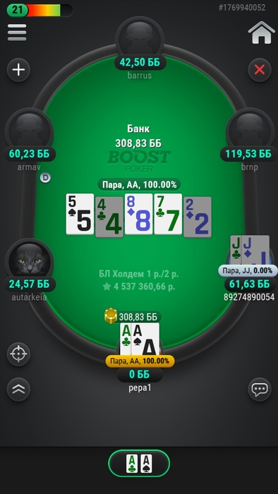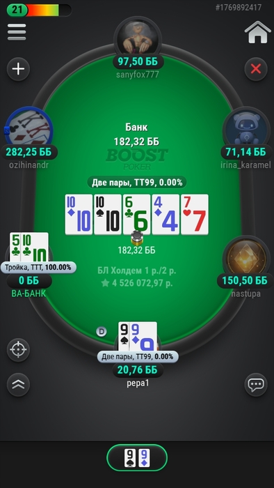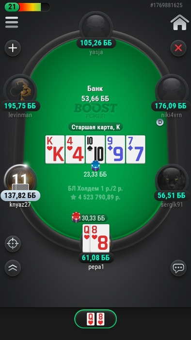 Он ч/р флоп я ререйзнула, терн чек чек, ривер он мал бет я запихала натупила знаю, хз че выбиваю)