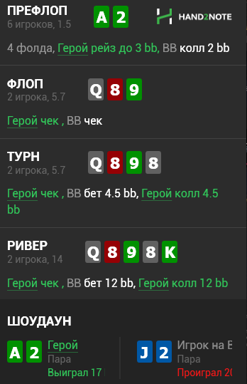 Короче больше мы в среднем заработаем тут от чека даже не смотря на то что жертвуем 11% еквити тут на его оверкарты. Это будет компенсироваться его блефами по сравнению с автофолдами терна, а с 5х мы доберем на ривере после чека в любом случае.