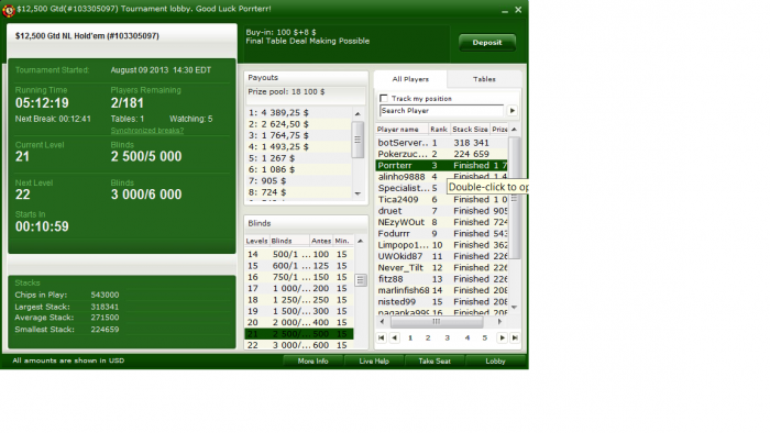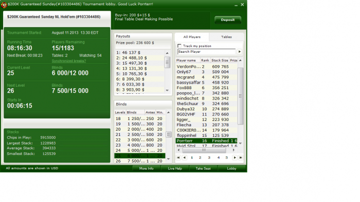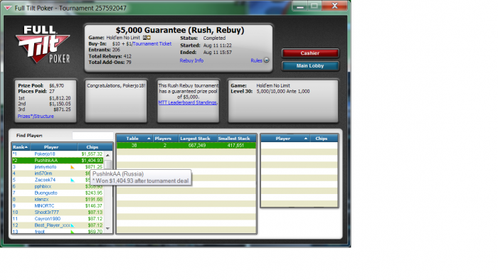 Хорошо заходило конечно, плюс втащил АК вс ТТ бб вс бат, оппы так себе играли, только на финалке двое активных(не считая тех кто уже вылетел), я даже одно время чипом побыл, но в 4максе уработали, когда я был топ2 стэком и оба активных в позе на меня и фиш шорт, не обного пота не дали забрать, а мне как спецом перестало заходить и беда с попаданиями в борд, даждавшись, когда фиш вылетел, выставился будучи уже сильно позади по чипам с К5о вс А8о и не доехал. А вообще, было несколько дипранов, которые тупо просрал, причем слил потупому... Отчасти конечно усталось сказывается, потому что сел играть в ночную из-за этих фтопсов-хуепсов, поначалу даже удвоился, но потом уработали таки. Доигрываю сейчас последние и на боковую. Завтра так же сяду наверное.