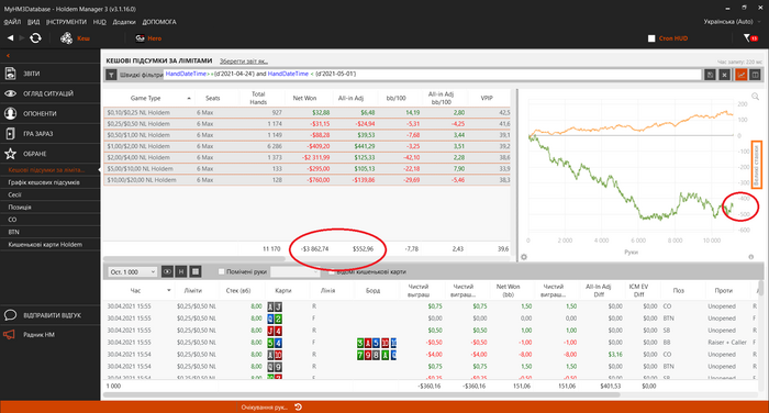 -100-200 БИ от ЕВ вообще в порядке вещей. Конкретно на скрине разница с ЕВ примерно 140 БИ, остальной минус, видимо, рейк, или я чего-то не понимаю. Диспа высока, и за пару сотен рук легко получить -30БИ, особенно печально такое, когда захаживаешь на лимиты повыше.