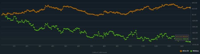 Сегодня поиграл в Short deck с анте 0.1$. За 1469 рук, если верить покеркрафту, проиграл ~90$. Количество денег в кассе уменьшилось на 128$. И при этом покеркрафт, насколько я понимаю, не учитывает джекпоты, которых у меня набралось на ~19$. Получается, что без учёта джекпотов я в реальности проиграл 147$, то есть на 57$ больше, чем уверяет покеркрафт.