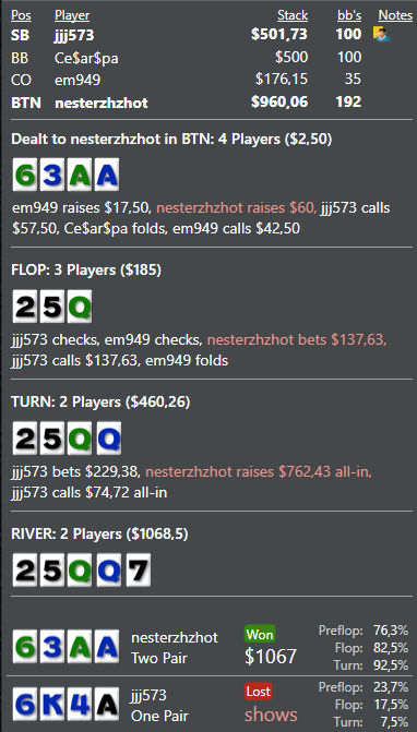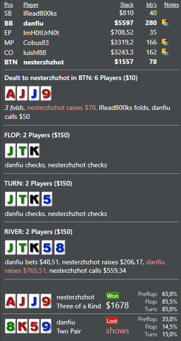 Как ты пришел к такому выводу, когда на ШД оппонент показал 2 пары, превращенные в блеф?