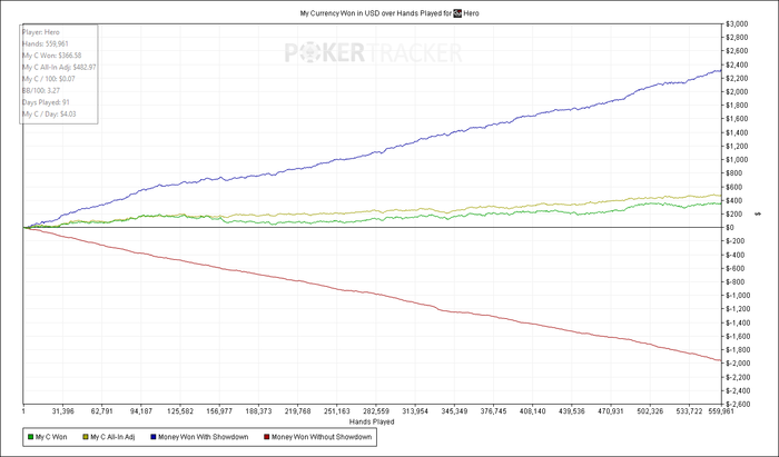 Сложно словами такое обьяснить)) Но попробую. Не знаю тенденцию игры кеша. Но в мтт есть разные страты, с совершенно разной красной. У меня товарищ хороший играет красная в минус валится чуть больше положенного а резы показывает уже больше года стабильные и вырос с аби 3 до аби 30. Тренера говорят -что главное ев, где сильно красная разогнана там чаще переблеф и синяя все равно будет падать.