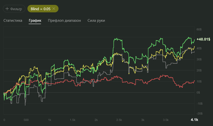 Зеленая то в плюс, это уже хорошо)) у тебя приличная дистанция, можно же в базе покапать и поискать ситуации где ты недооцениваешь фэ, а где можно добирать шире. Ну если хочется как то улучшить игру.