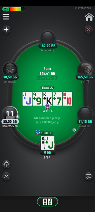 Сегодня покерный день начался с неприятной раздачи, с ВВ в префлопе залетела в АА и проиграла стек . Думала не отобьюсь, но потом старалась играть агрессивно, больше рейзить и это окупилось)
