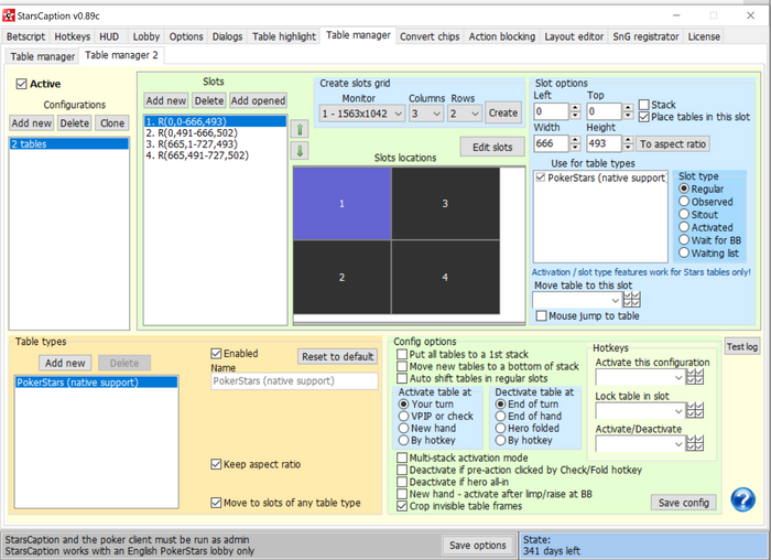 Если у вас такое случается, то включите эту опцию заранее перед сессией (а также Options / Logging / Betscript log), а когда в процессе игры случится проблема, сделайте скриншот стола. Далее пришлите мне скриншот и файл StarsCaption.log из папки с программой.
