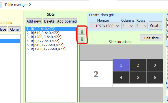 Если же ты создавал их из открытых столов, то нужно перемещать их в списке при помощи этих кнопок до тех пор, пока не получишь на диаграмме Slot locations нужную тебе конфигурацию (можно кликнуть непосредственно на изображение стола в диаграмме и двигать его кнопками со стрелками вверх или вниз по списку)