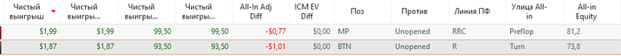 Подскажите кто знает, почему НМ3 не правильно считает ЕВ? Пример: у меня 74% на победу, пот 200бб, в итоге пишет -1.01$(50bb) от выигрыша, при этом ev фишки показывает правильно 73.8 блайндов. Первая строка 81% на победу; -- вторая 74%