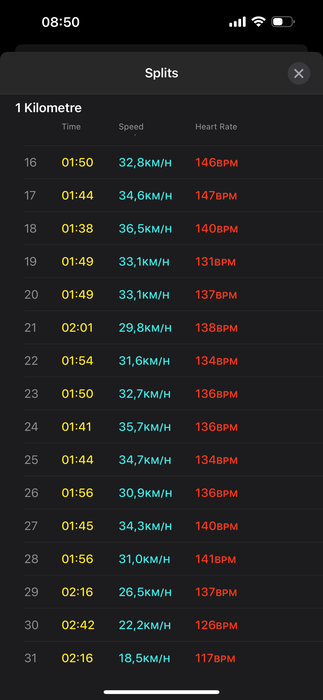 Ну и основная дистанция отлично выглядит. Ниже 30 не снижался, были километры и по 34-36.