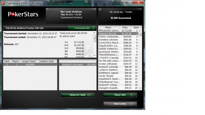 Завтра начинаю мини марафон. За три свободных дня до каникул буду неистового тащить, мочить баблы и всяких уе в сартирах и занесу много много килополян, бигов, регулярок, просто левых турнирах, играемых 25м окном) Всем, кто в деле, удачи!