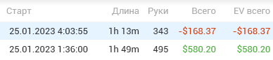 По поводу выходов из плохих сессий, я стараюсь играть только в А-гейме/хорошем состоянии и отслеживаю скорее это состояние, чем счёт в результатах сессии. Т.е. я могу выигрывать много стеков, но при этом затедектить у себя потерю концентрации и автоматические действия (просто устал/надоело/плохо себя чувствую) и закрыть столы. Или наоборот - сильно лететь, но если понимаю, что всё сыграл на совесть и не поплыл, причин выключать не вижу и продолжаю