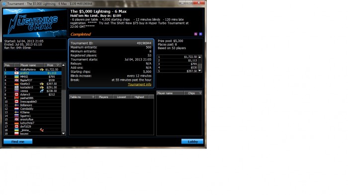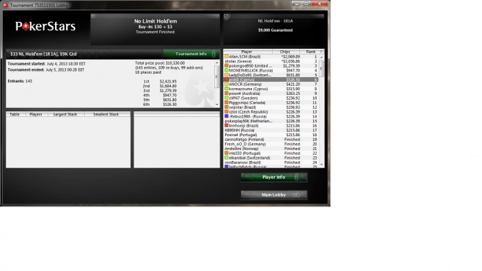 Сначала немного не доехал в 33 1р1а, на финалке долгое время был чипаком, но потом проиграл русскому фишу 910<77, сначала он на бб с 15 блайндами заколил префлоп рейз с утг ))) Потом заплатил кбет на флопе 2 8 10, ну и терном поймал божественную 7, я выкинуть уже не мог там никак )