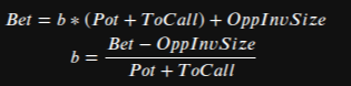 Где b - размер ставки/рейза в процентах, OppInvSize - размер новых вложений оппонента на текущей улице последним действием, ToCall - сколько нужно на колл, Pot - размер банка, Bet - размер ставки/рейза.