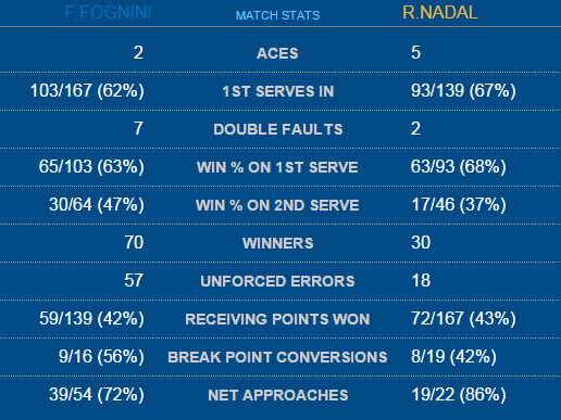 - Фоньини-Надаль 3-6, 4-6, 6-4, 6-3, 6-4. Гладиаторский поединок. История немного похожа на Пэра и Робредо, но Надаль все-таки не инженер, а мастер. Фоньини уж очень великолепную форму набрал этим летом, я видел почти все его матчи в Гамбурге, где он в финале проиграл тому же Надалю.