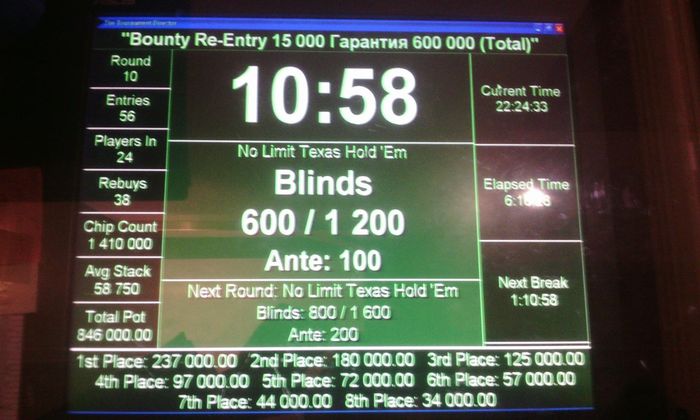 Второй турнир дня Bounty Re-Entry по 15 000 (5 000 за bounty) собрал 56 участников и призовой фонд составил 846 000 руб., так же борьба шла за внушительный bounty фонд 470 000 руб., победитель турнира кстати унёс с собой 13 bounty.