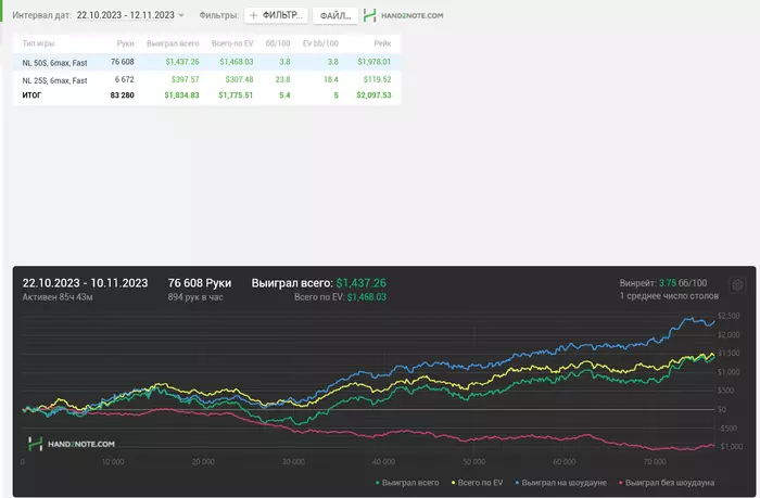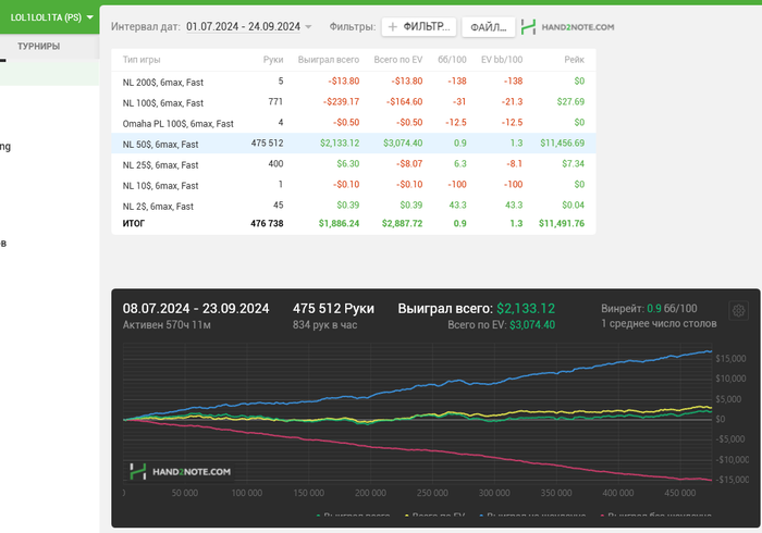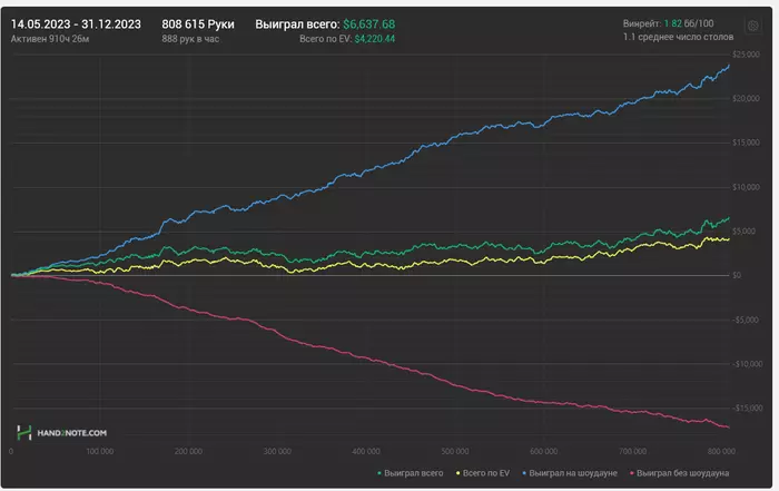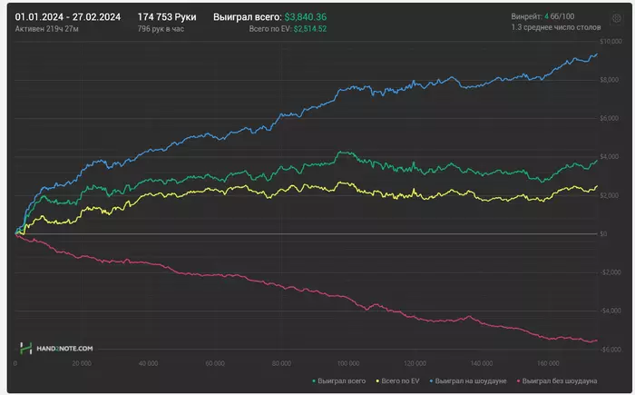 Под спойлером - график с начала января на H2N, неизбежно часть рук теряется, но суть очевидна - отрезок хороший для меня. Связан он с тем, что в какой-то момент я в районе 20 стеков на нл100 выиграл по базе, но потом их обратно отмотало почти полностью, хотя с учетом переапа в деньгах на НЛ50 все равно прилично получилось :) за зиму однозначно больше намотало, в сравнении с летом и осенью