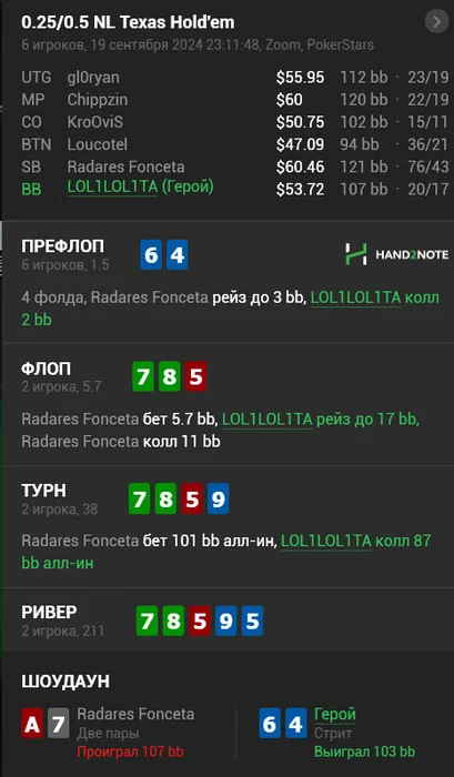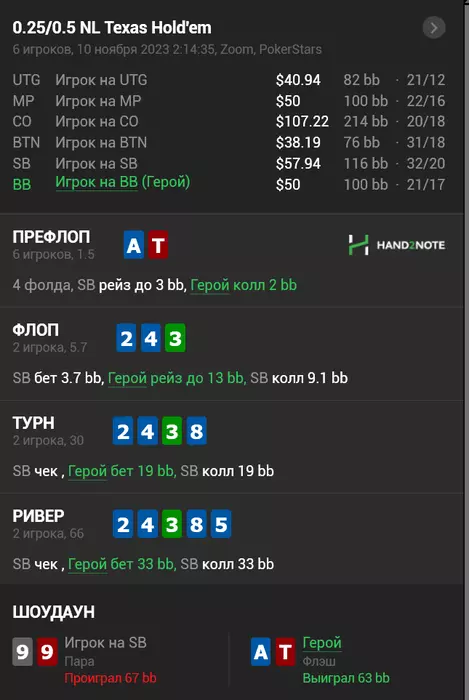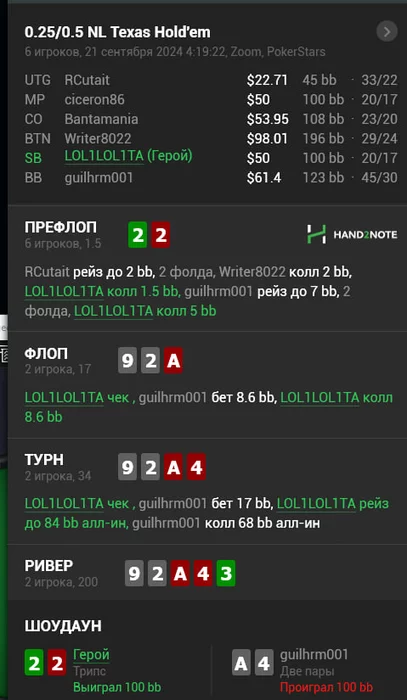 Соточку сначала хотел побольше катать чтобы быстрее рейк набить, и практиковаться в покерном кунг-фу. В какой-то момент в 4 стола катал её несколько суток, затем по динамике принял решение глянуть результаты,увидел просадку в бай-инов 12 и решил не рисковать усугублением :) диспа конечно да, составы очень плотные охох, неужели вообще есть потенциал бить тамошние составы в 2-3бб/100 ? Не представляю. По последним впечатлениям от собственной игры, наконец-то стал показывать в Зум50 стабильные +0.5-1bb/100 , и считаю это отпадным результатом, ради которого пришлось большой объем внутренней работы проделать. Отдельная благодарочка за участие в Gold группе от Gipsy, только-только это было в октябре 2023 и вот уже который раз спасибо большое Антону НКО1 за бумажки под подушкой и их шелест 🤑💪 От души, для меня наглядное доказательство что на моих лимитах то что надо учиться и расти - must have 100%