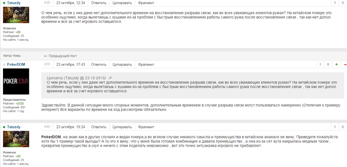 Поняла,что тема со страховкой обрывов связи ( а вообще обрывы какие то странные уж очень) и дополнительным временем на восстановление в игровом процессе, глухая и админы прикидываются "вениками" . Я так и написала,что если это норма,то желания и смысла играть на лимитах выше и терять на таких искусственных скупах, нет совершенно. И таким образом новый развивающийся рум только вызывает недоверие и отвращение у клиентов.Странная политика так то. Какие -то левые выгоды придумывают от искусственного обрыва связи самим игроком. На предложение привести хотя бы 1 пример такой выгоды - тишина. Не знаю как там в других видах покера, а любой обрыв связи в китайском покере -это практически прямой путь к скупу. При этом , если в режиме нескольких раундов, а ты так вылетаешь в трубу на первом, то тебя тупо продолжают ощипывать как курицу и в следующих раздачах, пока ты в ситауте и ты ничего с этим поделать не можешь, при этом, даже если обрыв реальный и ты быстро восстанавливаешь связь,то само обновление и подключение работы приложения очень тормозное и не успеешь по-любому вернуться до истечения игрового времени. Априори игровое время не может быть в том числе и временем страховки на восстановление связи,а уж с учетом тормознутости самого обновления приложения ,оно должно составлять от 1 до 3 минут. В общем, это очень серьезная проблема и разочарование.Думаю,что многие уже это на себе испытали и есть с чем сравнить. Во всяком случае я не могу из тех нескольких румов, где играю , припомнить хотя бы еще 1,в котором эту проблему считали несерьезной и не решали к радости клиента,ибо, когда клиент доволен,то несет бабло . Были проблемы у Тони как то, а так же на Гамблере,но сейчас их нет, именно потому что, как раз позицию " дополнительное страховочной время при потере связи" расширили и времени достаточно для восстановления и сами приложения включаются в полноценный режим работы за 5-10 сек после восстановления связи.