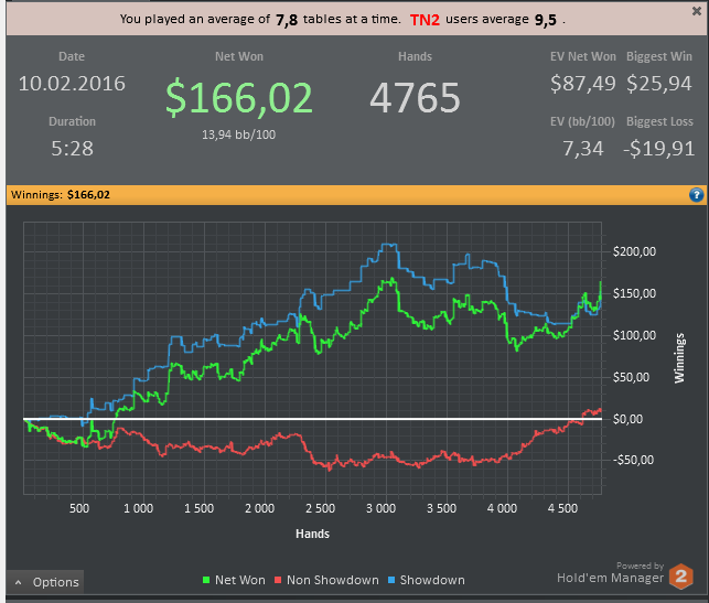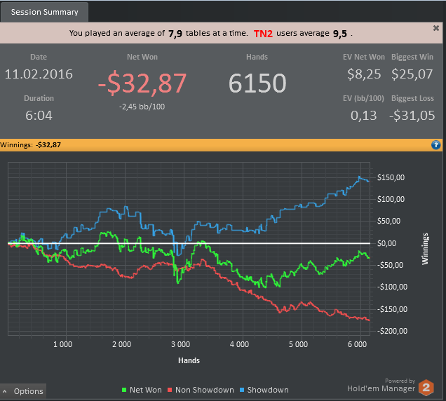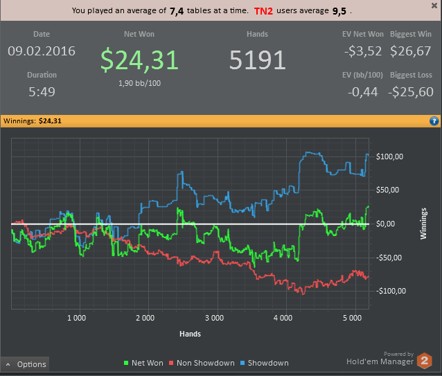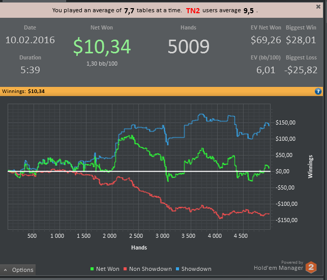 некоторое время не писал . Уже в который рез пробую нл50 , и в который раз много заливаю , причём со многими регами я много играл на нл25 , да и нл50 вроди как не сильно отличается , но все-ровно много заливаю , у меня какой-то психологический барьер , на нл25 играю уверенно(думаю что 4ББ на 100 имею) , а вот нл 50 -8ББ на 100 , просто резко моя игра катиться в низ . Залил на нл50 почти 700$ , да и ещё на нл25 залил , пока восстанавливался после 3-4 дней залива , на за поду дней всё же сделал винрейт 4+ББ на 100