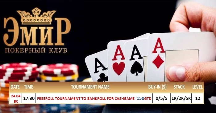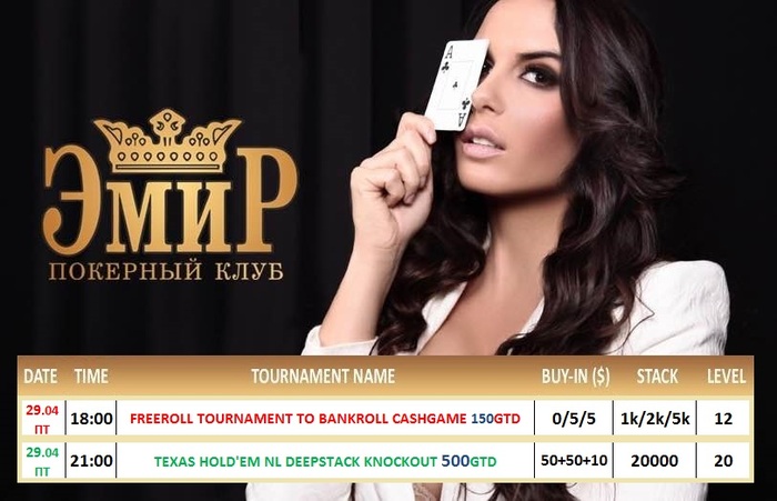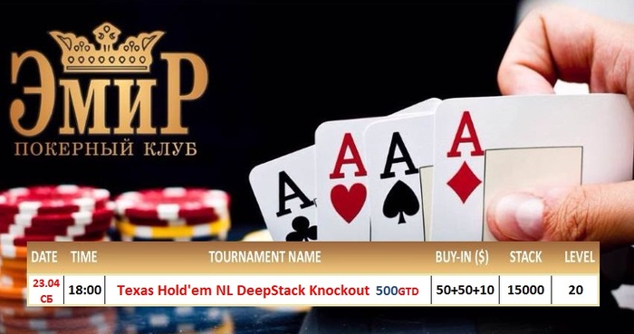 Друзья, приглашаем Вас в покерный клуб "Эмир"! 28 апреля в 20:00 состоится турнир Texas Hold'em NL DeepStack Re-entry. Buy-in 1 000 000 ГАРАНТИЯ на турнир 10 000 000 Начальный стек 20 000 фишек. Уровни по 20 минут.