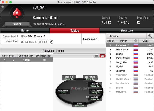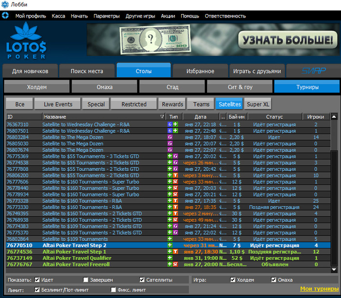 Прямо сейчас идёт регистрация на очередной турнир Altai Poker Travel Step 2 за $7. Пока зарегистрировались 4 человека, к которым добавятся пара игроков из сателлита Step 1 за $1,1.