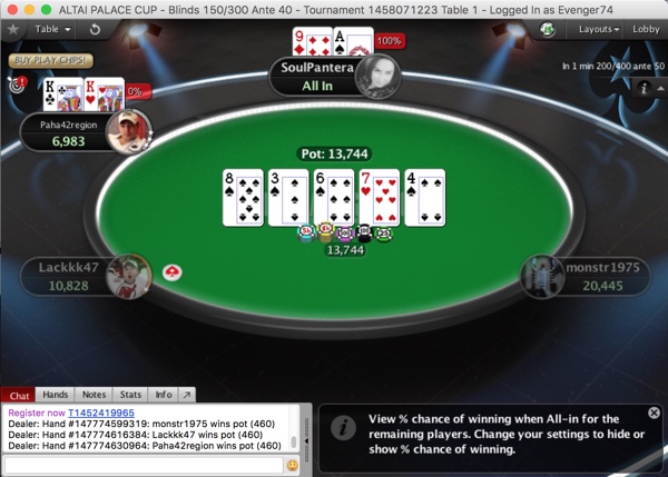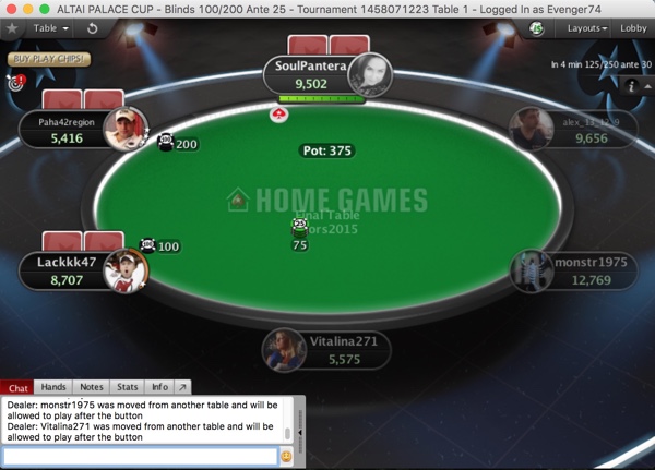 После вчерашних опытов с фризаутом серия вернулась к старому-доброму ребайнику на Altai Palace Cup по 1,000. На руках у игроков было девять билетов на него, и ровно столько же последовало регистраций. Правда, когда были пущены часы, игроки не оказались сразу за "финальным" столом, а расселись по двум. Как бы сказали об этом в советское время, сыграл человеческий фактор - наш царь и бог APT Online случайно выбрал для турнира структуру любимой им омахи, а когда косяк всплыл, менять что-то было уже поздно. В общем, вместо 9-max получилось два стола по 4-max, что увеличило его продолжительность игры, но сделало ее интересней.