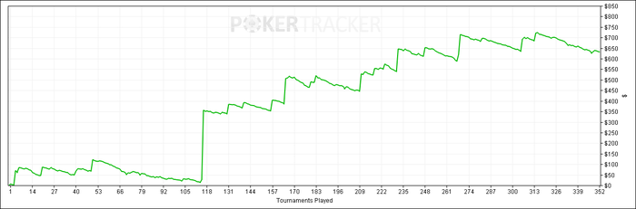 Подведу итоги первого полноценного месяца в МТТ. Дебют удался) Было много финалок, но мало топ-3. Особенно радует уровень игры, очень много фишей. Прогрессив нокаут за 11$ вообще не отличить от нока за 1.5$) Прям глоток свежего воздуха после этих снгшек забитыми регами (это в большей степени к 4.5$ относится). Вот тут, в отличие от вышеупомянутых снгшек, я с уверенностью могу сказать, что бью поляну) И винрейты это подтверждают. График получился вот такой + завтра и после завтра буду играть, может что еще получится занести.