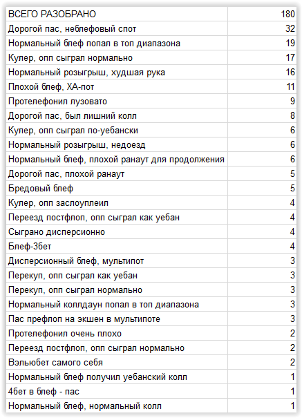 Разобрал только 180, но это самые крупных поты, где проигранно более 8 бб.
