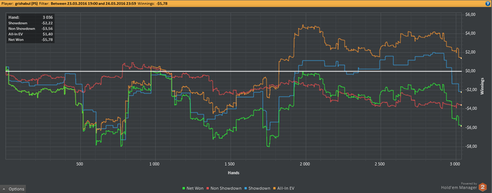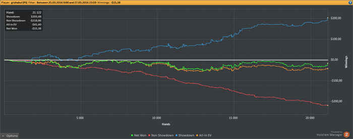 Болтался сначала с ноль, потом случилась неприятная раздача, после которой я тильтанул, ну и там уже понеслась(