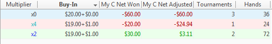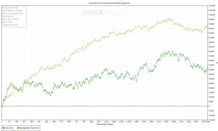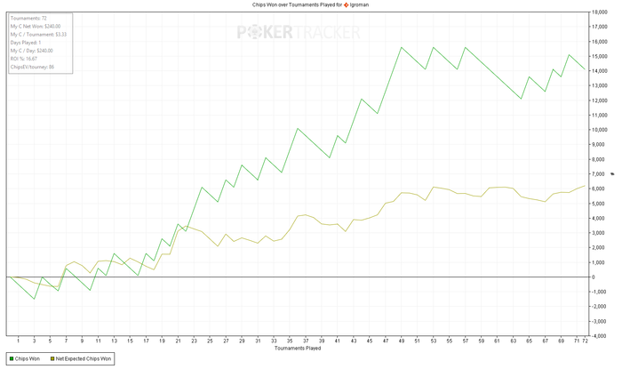 С пати пока полный провал, меня так за все время стрикануло только 1 раз на старзах около 9 месяцев назад. Уже 800 турниров играю в 0-. Сделал разбор регов, своей игры, но все равно это не помогло. Оппы выигрывают на эни ту + я всегда ниже в префлоп выставлениях. В общем впал в небольшую депрессию. Общий график держится пока на 50 фишках, что стало довольно печально(при этом зеленая примерно также). Общий минус на пати 5000$(уже 250би!) за 3000 турниров. Явный недобор по множителям + крупные множители я вообще не тащу, нокауты если и делаю то с 5 попытки Пока в замешательстве, не то я что-то не так делаю, не то просто банальное невезение.