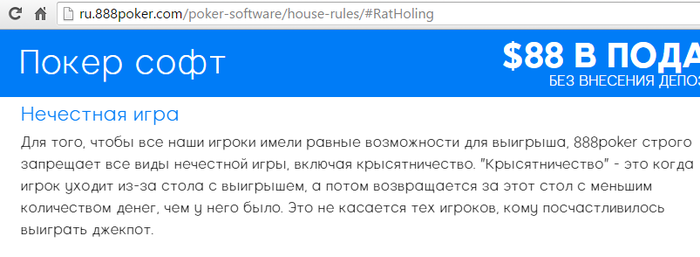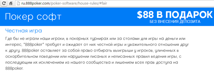 Смешно это, уважаемые. Фер же не покеристом является. Он бамхантер, бизнесмен, для которого покер это перераспределение финансов. Покеристы же рубятся между собой на хайстейкс не потому что они раньше жили в СПб, а потом переехали в Лондон, а потому что для них деньги не цель, цель - игра. Вот у фера цель наживать бабулет там, где менее подготовленные его дарят. И я, и вы знаем, что Фер никогда не сядет в зум полный регов, это просто не принесет прибыли, а то обернется и серьезным убытком.Поэтому Фер и дал оценку изе, мол лечение ему нужно. На деле же, я не думаю что Изя вообще когда либо смог бы участвовать в таком вот сраче из за пяти блайндов в любой роли. В остальном же, тот парень что начал эту тему, тоже видимо чем то обижен, раз ну вот Фер выходил и блины не ставил, а он ставил. Лох ты, тс, потому что во первых, ты не сделал так же, а во вторых то, что ты лох ты сделал еще и достоянием общественности. Самое интересное, ты начал, а Фер начал оправдываться, а суть вопроса? Суть в том, что он зашарил что так можно, а ты нет. Но еще интереснее то, что Фер начал вот эту оправдаловку, мол не виновата я, он сам пришёл. Не знаю конечно зачем Фер начал оправдываться, 1) не за что там оправдываться, 2)еще одно доказательство что Фер - не поккрист. А вот это моралфажество, мол честно это, или не честно, как правильно написал паренек один тут в теме, что искать честность в игре в карты на деньги, такое же как и поиск любви в публичном доме. А Фер, как личность, очень даже интересно почитать, образ мысли и все такое, но понимать надо что покер для него это бизнес, а не стиль жизни. Концепция игры в покер у него другая, и цели другие, оттого он и сохраняет анонимность. Ну и логично, что он отследил что система несовершенна, и мает с этого в полудохлом LHE. Это такой подход, если угодно - вкус, а о вкусах не спорят, моветон, как вы сами понимаете. P.s. думал что 888 это говнорум и уважающие себя люди там не играют.