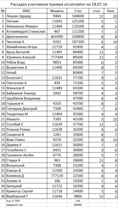 Вчера состоялся первый день турнира Accumulator.Всего в турнире приняло участие 144 спортсмена.По окончании 12-ти раундов по 30 минут в турнире осталось 36 человек.Средний стек составляет 60 000 Рассадка на сегодня ниже на изображении: